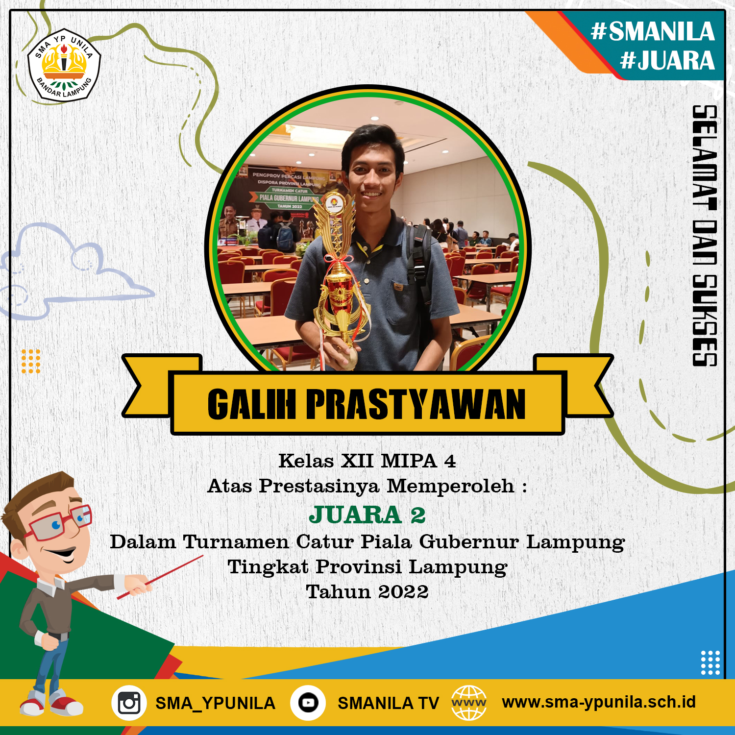Selamat kepada Galih Prastyawan kelas XII MIPA 4 yang telah Memperoleh Juara 2 Turnamen Catur Piala Gubernur Lampung pada 21 – 23 Desember 2022