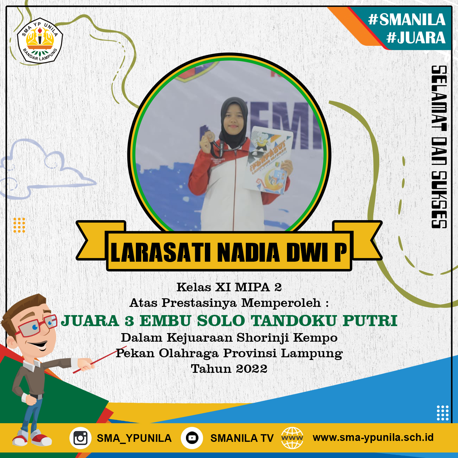 Selamat kepada Larasati Nadia Dwi Putri kelas XI MIPA 2 yang telah Memperoleh Juara 3 Embu Solo Tandoku Putri Remaja B