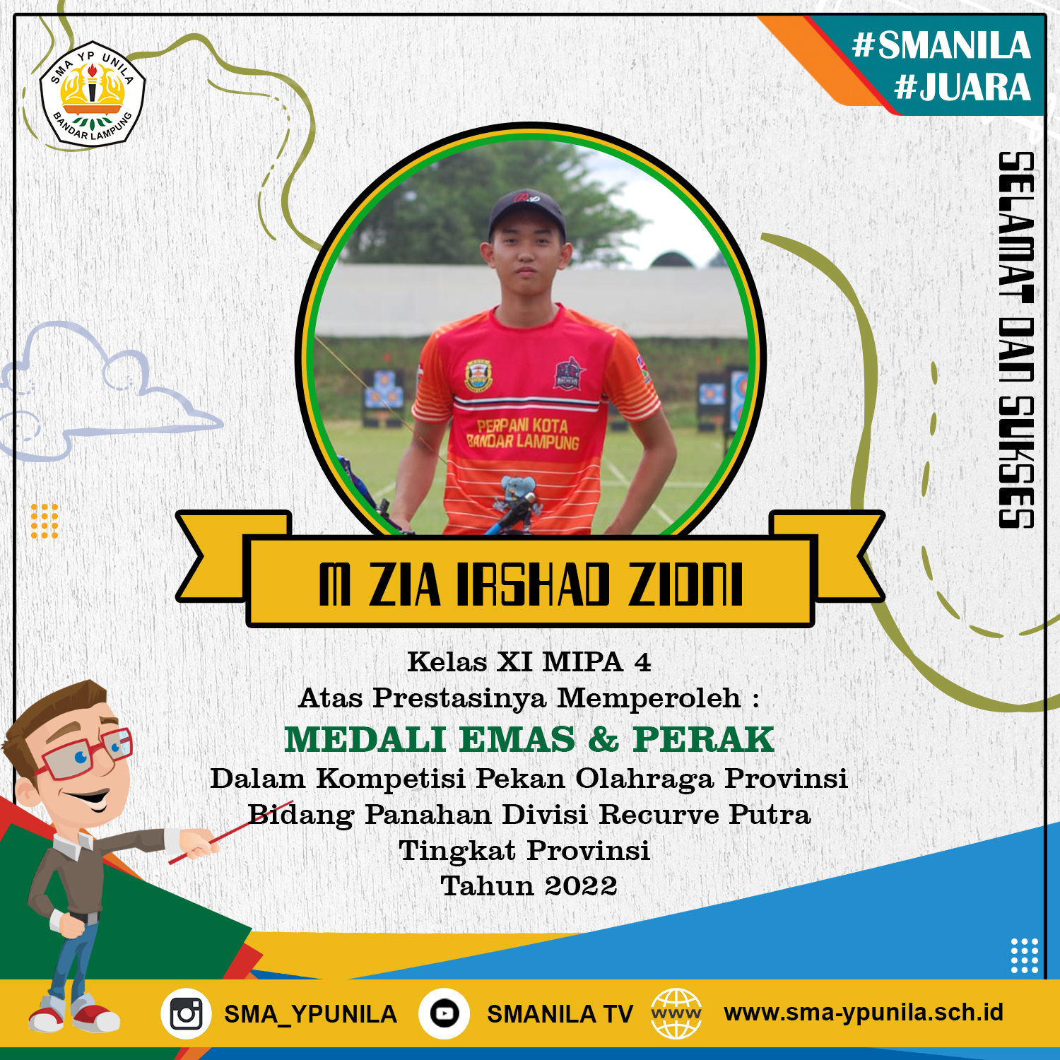 Selamat kepada Muhammad Zia Irshad Zidni kelas XI MIPA 4 yang telah memenangkan 1 Medali Emas Total Score Team Putra Babak Qualifikasi dan 1 Medali Perak Team Putra Babak Eliminasi Pada Kompetisi Pekan Olahraga Provinsi (Porprov) Lampung tahun 2022. Semoga …