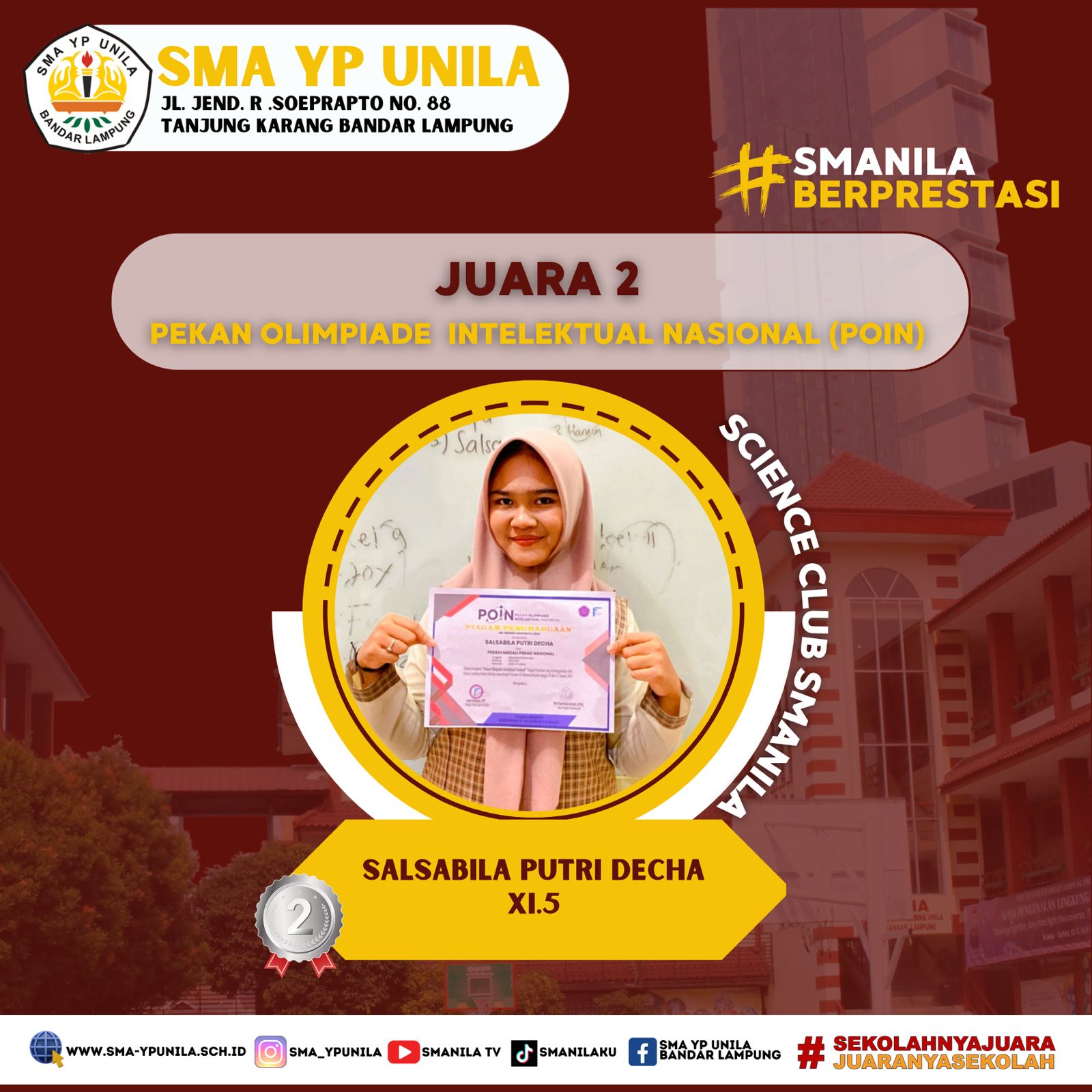 Selamat & Sukses atas prestasi yang diraih oleh, Salsabila Putri Decha kelas XI.5 dari Eskul Science Club (SC) Smanila. Sebagai peraih, Juara 2 pada Pekan Olimpiade Intelektual Nasional (POIN) Tingkat Nasional yang diselenggarakan Focus Learning Institut. (Minggu, 21 Januari 2024)