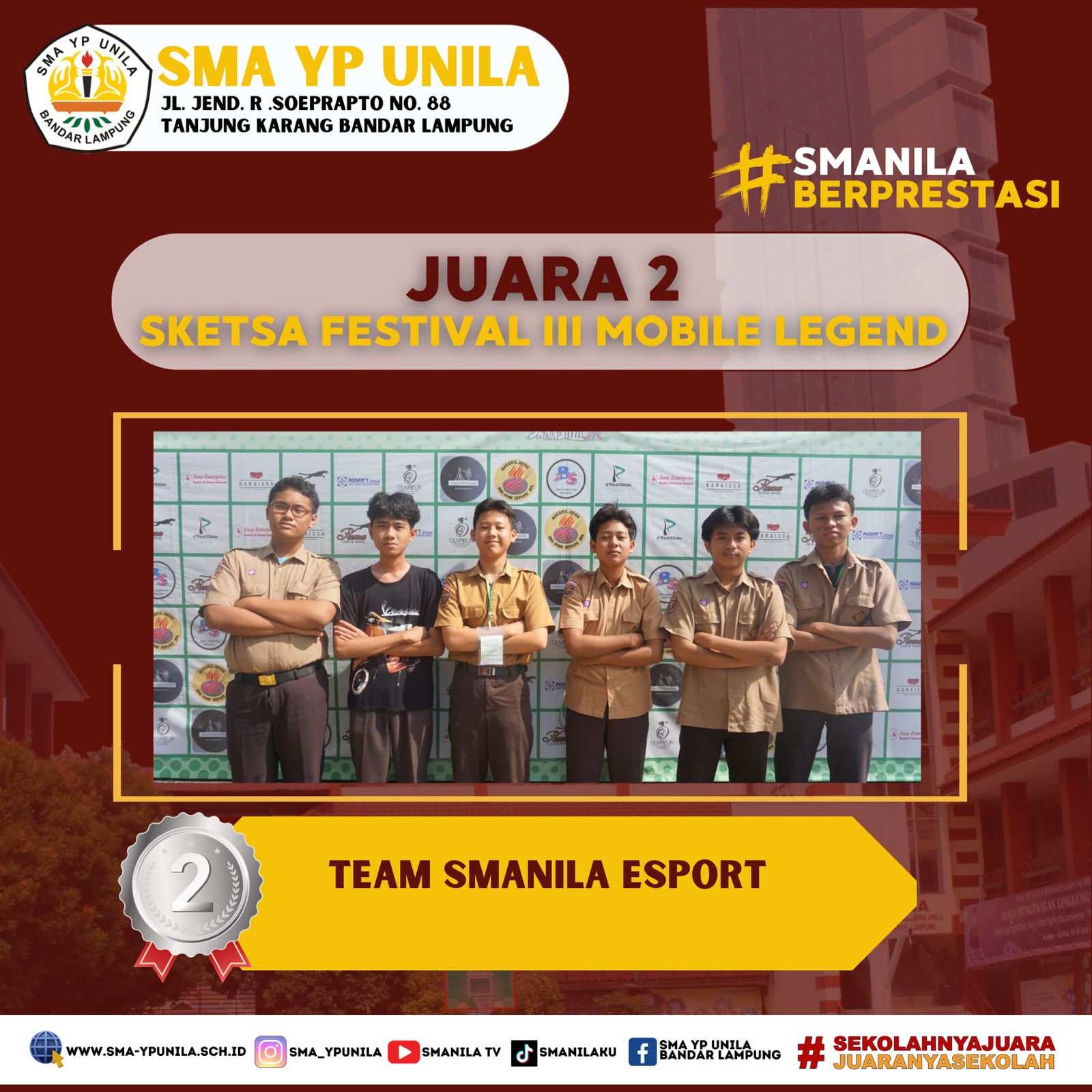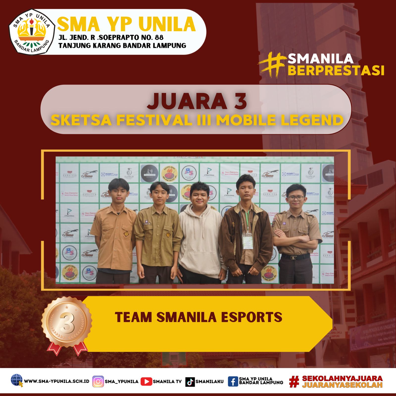 Selamat & Sukses atas prestasi yang diraih oleh, anggota Smanila Esports. Sebagai peraih, Juara 3 Tingkat Kota pada Sketsa Festival III Mobile Legend, SMK Farmasi Bandarlampung 2024. (Jumat, 02 Februari 2024) Team : – Alfaj Levy Latiffaziz X.1 – Dimas …