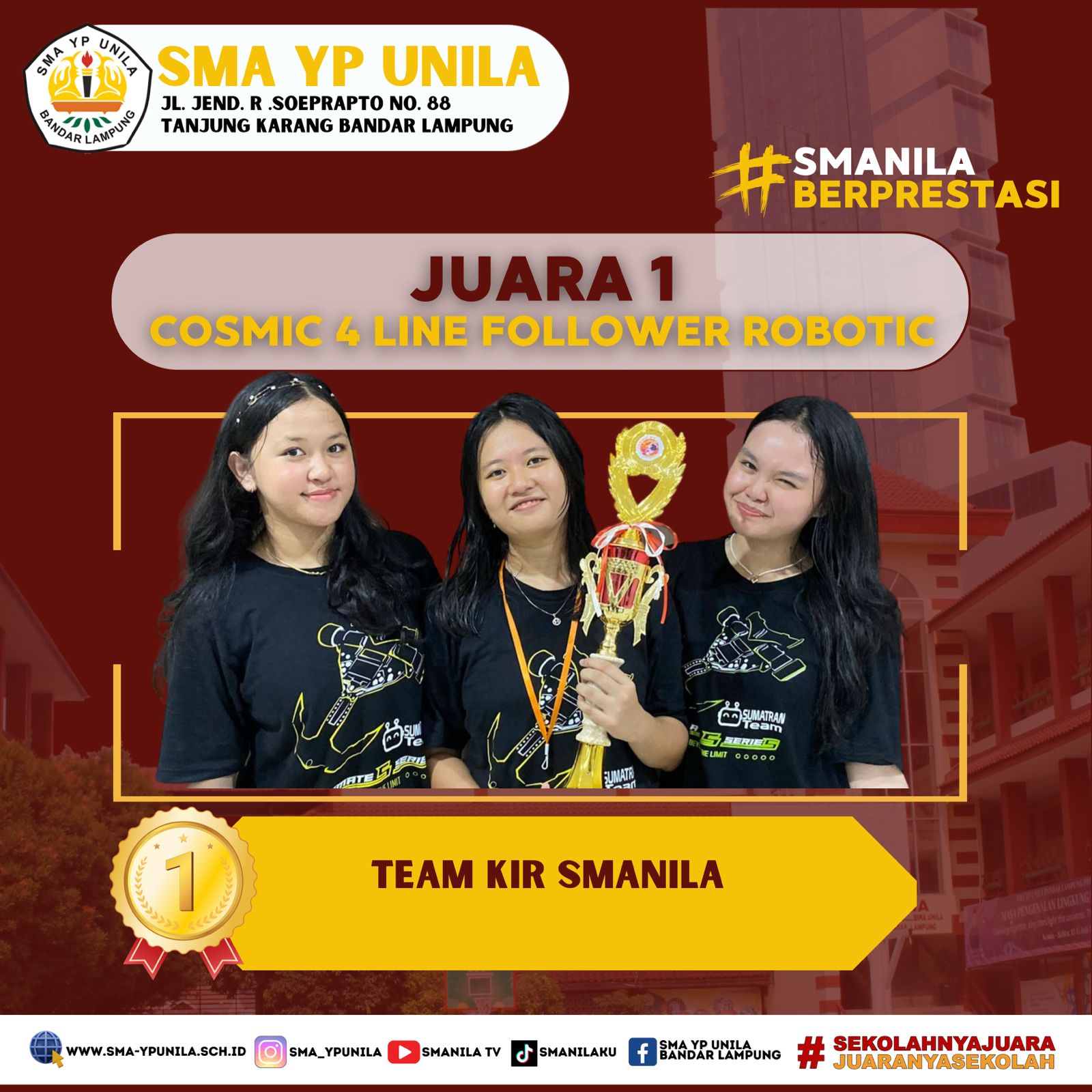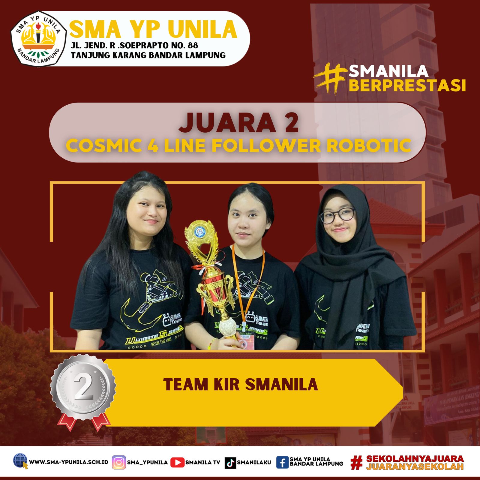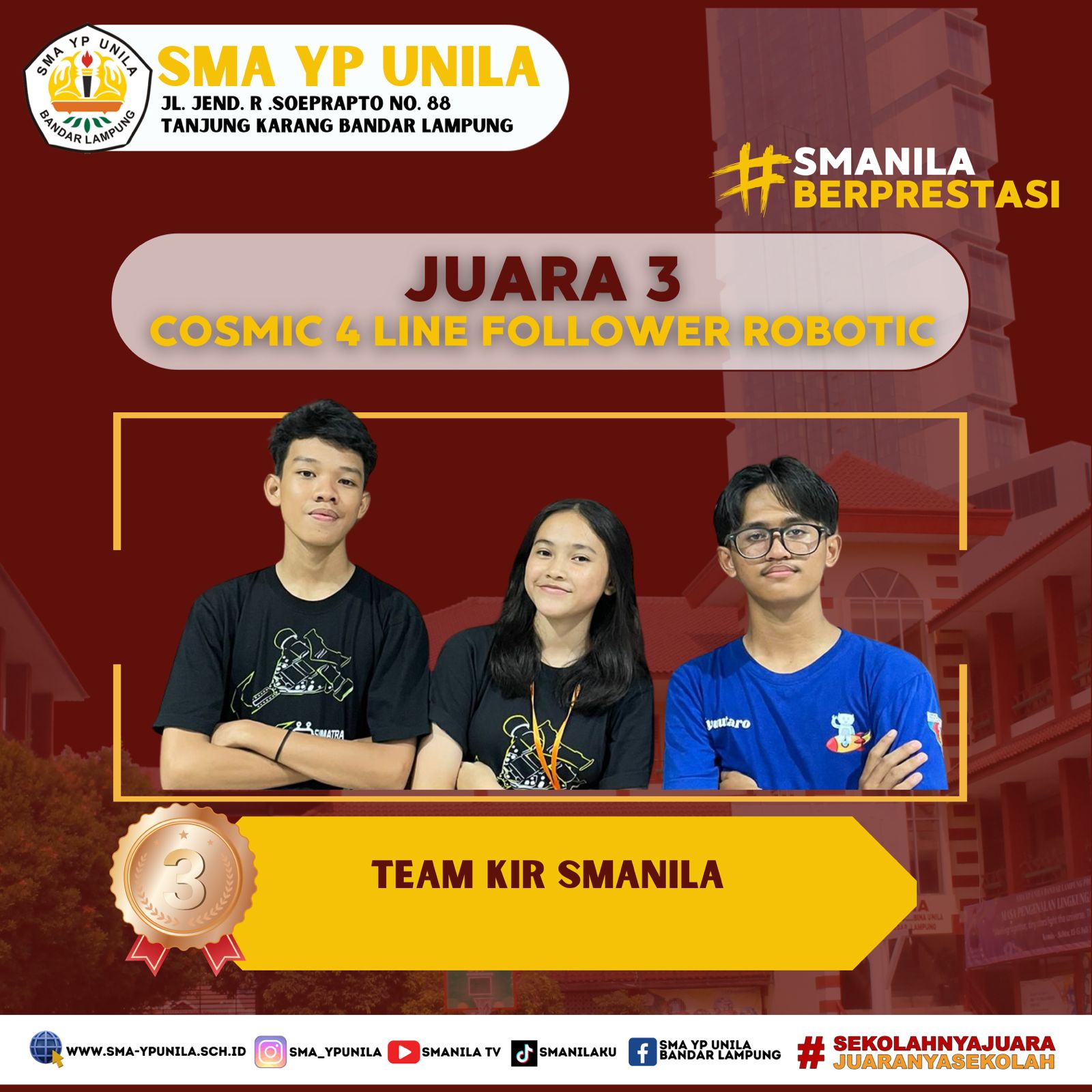 Selamat & Sukses atas prestasi yang diraih oleh, anggota KIR Smanila. Sebagai peraih, Juara 2 Tingkat Provinsi pada Lomba Cosmic 4 Line Follower Robotic, SMA Muhammadiyah Ahmad Dahlan Metro. (Sabtu, 03 Februari 2024) Team : – Syaluna Putri S. XI.1 …