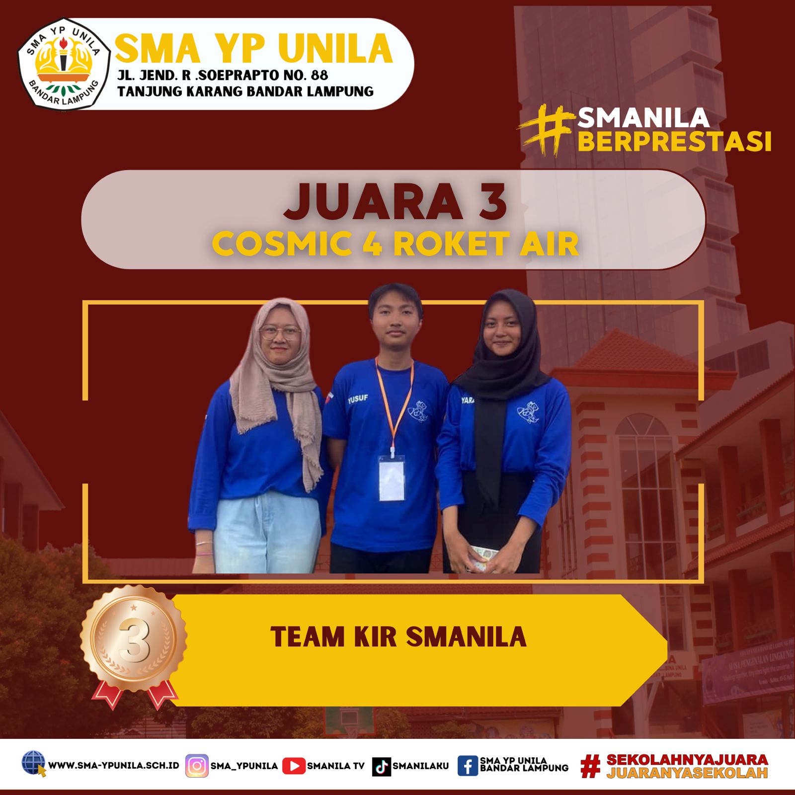 Selamat & Sukses atas prestasi yang diraih oleh, anggota KIR Smanila. Sebagai peraih, Juara 3 Tingkat Provinsi pada Lomba Rocket Air Amuse XIV, SMA AL Kautsar Bandarlampung 2024. (Sabtu, 26 Januari 2024) Team : – M. Yunus Kifli XI.2 – …