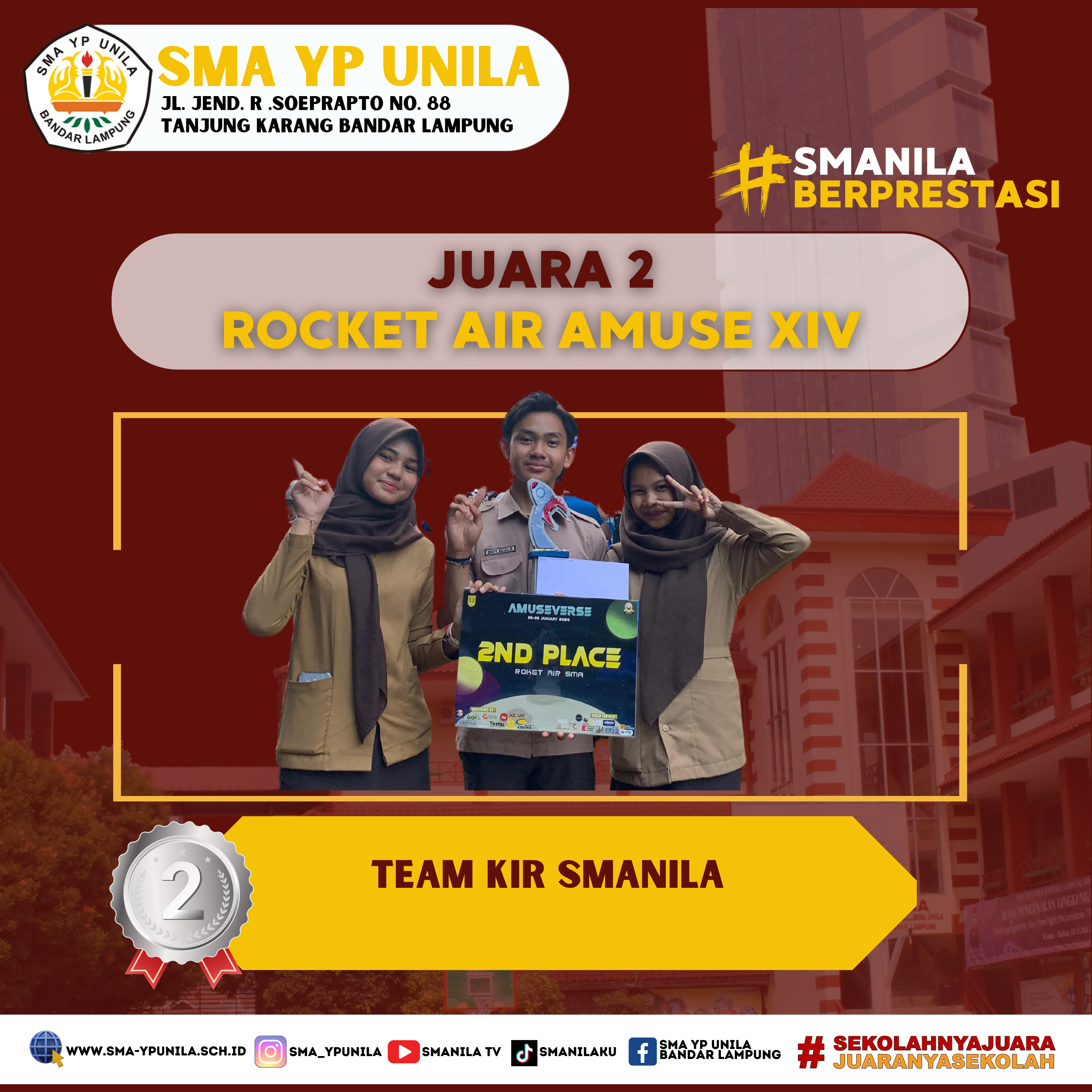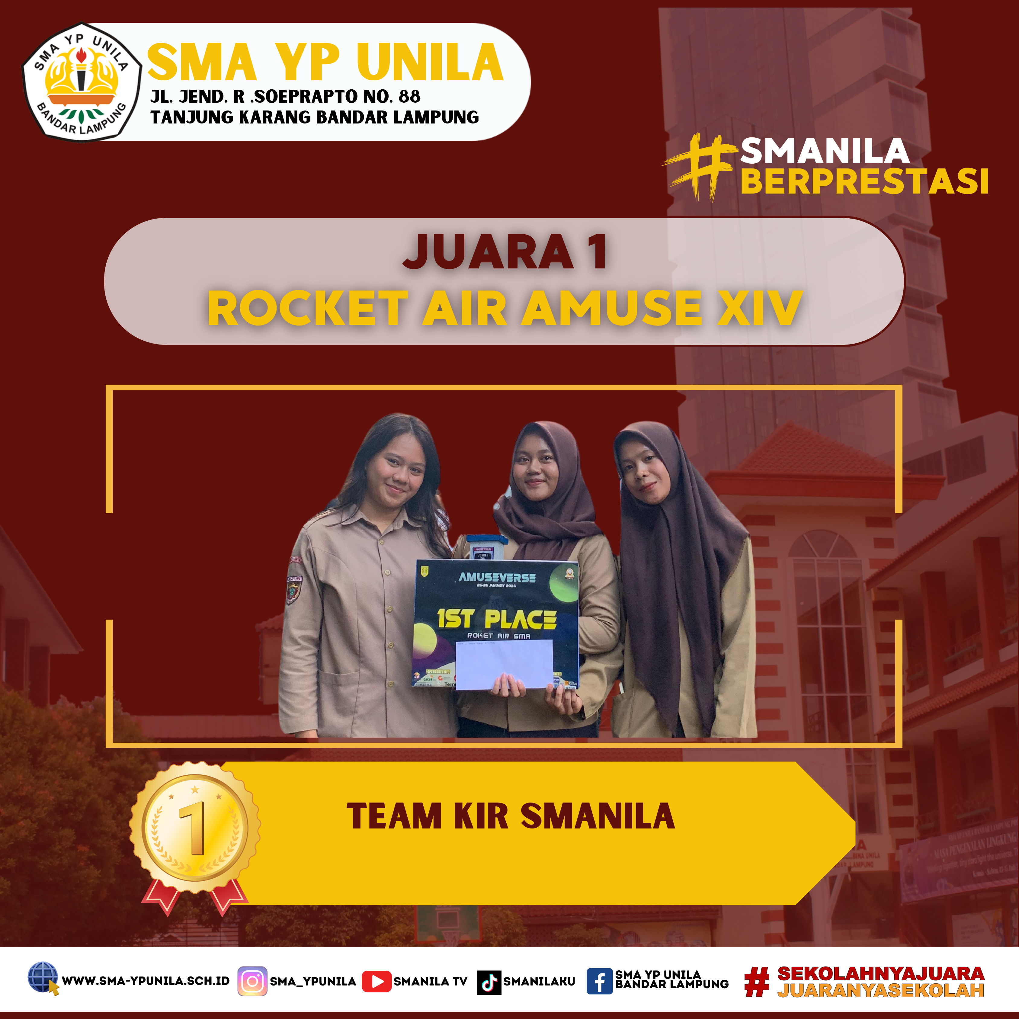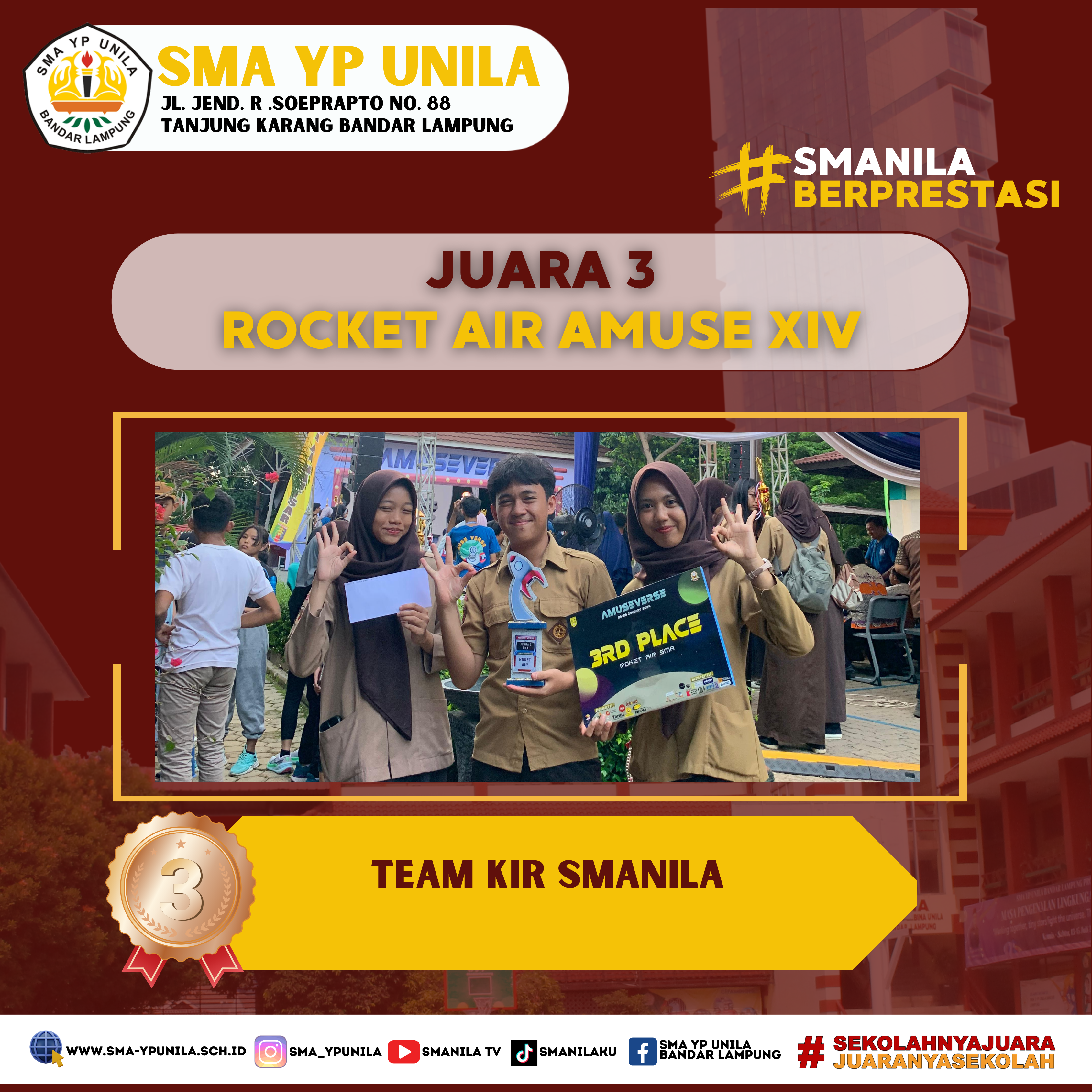Selamat & Sukses atas prestasi yang diraih oleh, anggota KIR Smanila. Sebagai peraih, Juara 1 Tingkat Provinsi pada Lomba Rocket Air Amuse XIV, SMA AL Kautsar Bandarlampung 2024. (Kamis, 24 Januari 2024) Team : – Raisha Nur Aliyah XI.1 – …