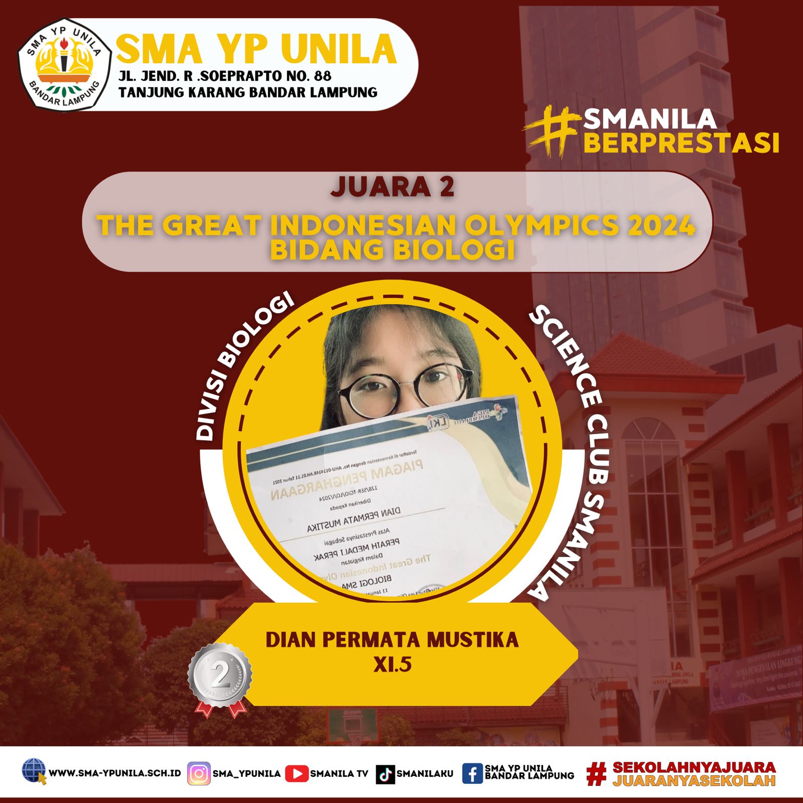 Selamat & Sukses atas prestasi yang diraih oleh, Dian Permata Mustika kelas XI.5 dari Eskul Science Club (SC) Smanila. Sebagai peraih, Juara 2 The Great Indonesian Olympics 2024 Bidang Biologi yang diselenggarakan Liga Olimpiade. (Kamis, 11 Januari 2024)