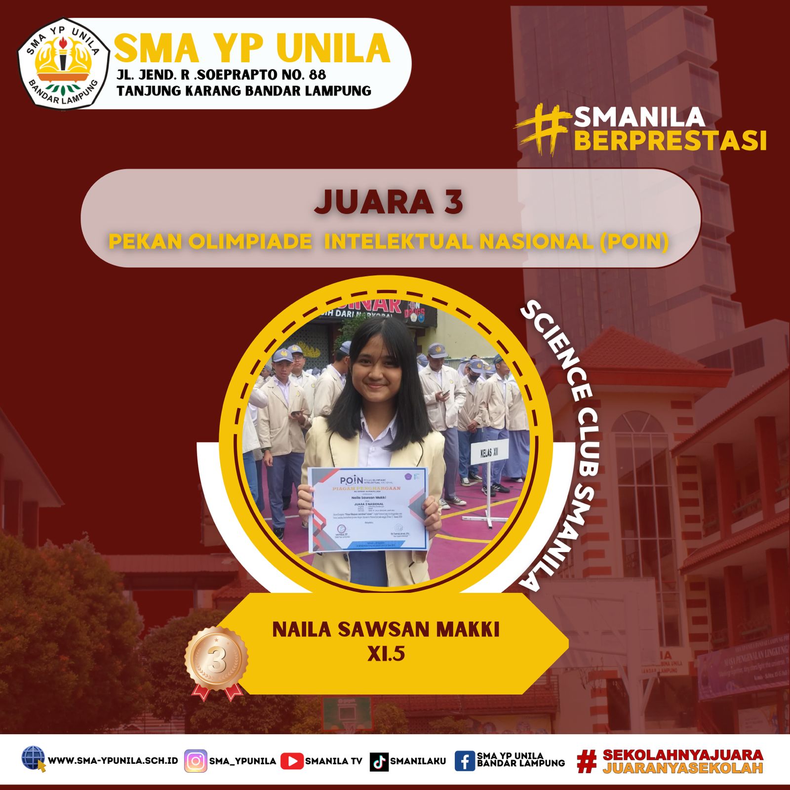 Selamat & Sukses atas prestasi yang diraih oleh, Naila Sawsan Makki kelas XI.5 dari Eskul Science Club (SC) Smanila. Sebagai peraih, Juara 3 pada Pekan Olimpiade Intelektual Nasional (POIN) Tingkat Nasional yang diselenggarakan Focus Learning Institut. (Minggu, 21 Januari 2024)
