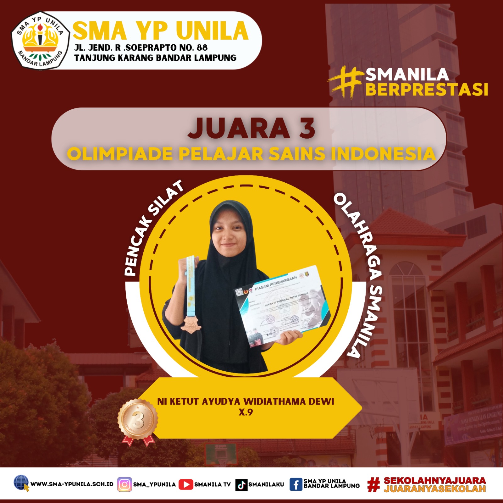 Selamat & Sukses atas prestasi yang diraih oleh, Ni Ketut Ayudya Widiathama Dewi kelas X.9 dari Pencak Silat Eskul Olahraga Smanila. Sebagai peraih, Juara 3 pada IPSI Lampung Open 1 yang diselenggarakan di Padepokan IPSI Lampung. (Kamis-Minggu, 18-21 Januari 2024)