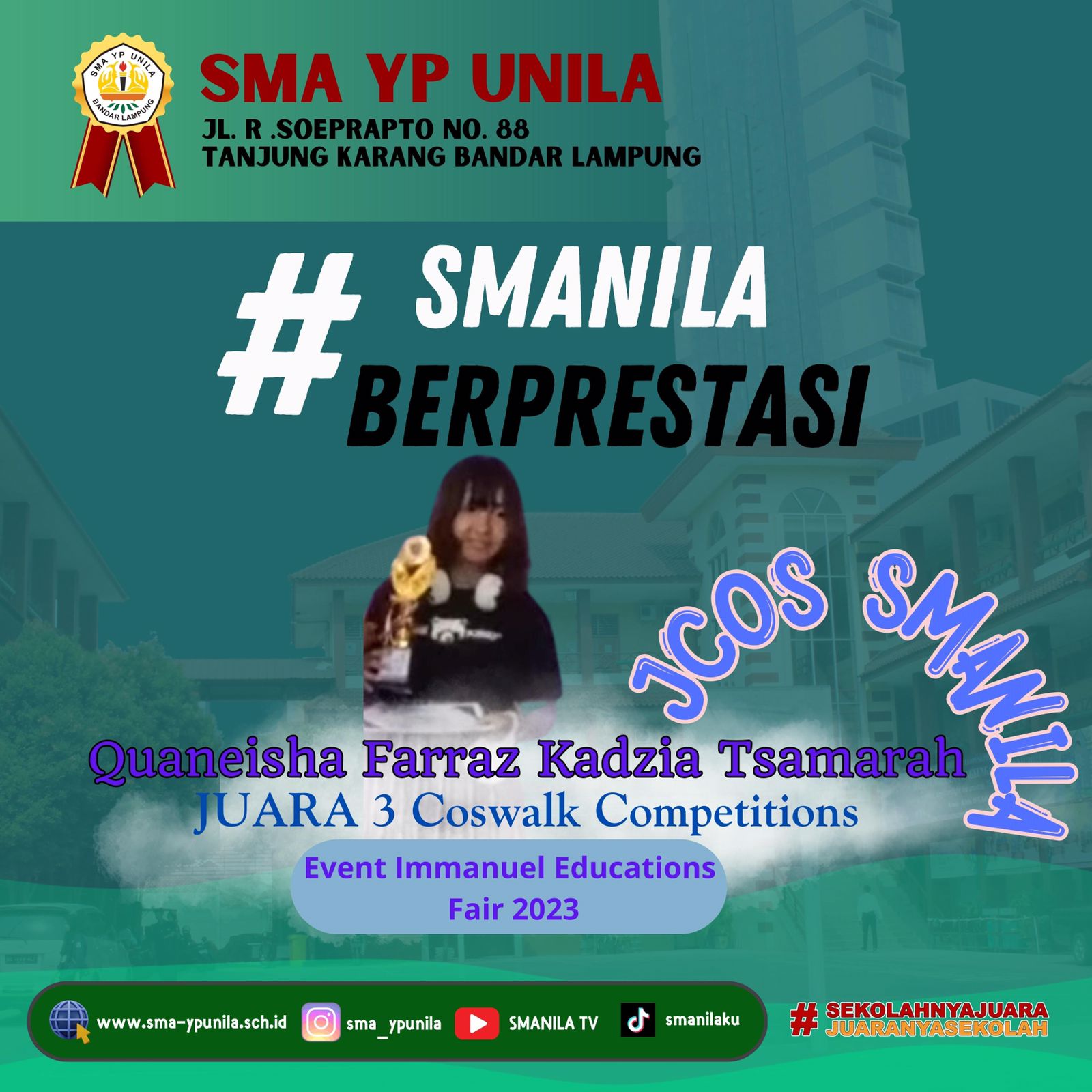 Selamat & Sukses atas prestasi yang diraih oleh, Quaneisha Farraz Kadzia Tsamarah Kelas X.2 anggota Eskul Jcos Smanila meraih, Juara 3 Lomba Coswalk Competition pada Event Immanuel Educations Fair Tingkat Kota 2023