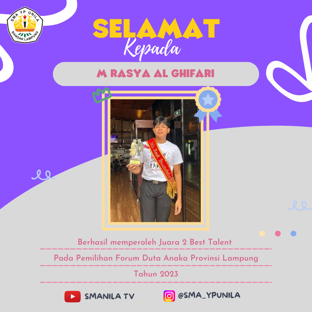 Selamat untuk ananda M RASYA AL GHIFARI yang telah berhasil memperoleh juara 2 Best Talent / Performance pada Pemilihan Forum Duta Anak Provinsi Lampung Tahun 2023 Semoga prestasi yang membanggakan ini dapat menginspirasi rekan-rekan yang lain. #smanilajuara #2023yepeaja #sekolahfavorit #bandarlampung #smaswasta #lampung