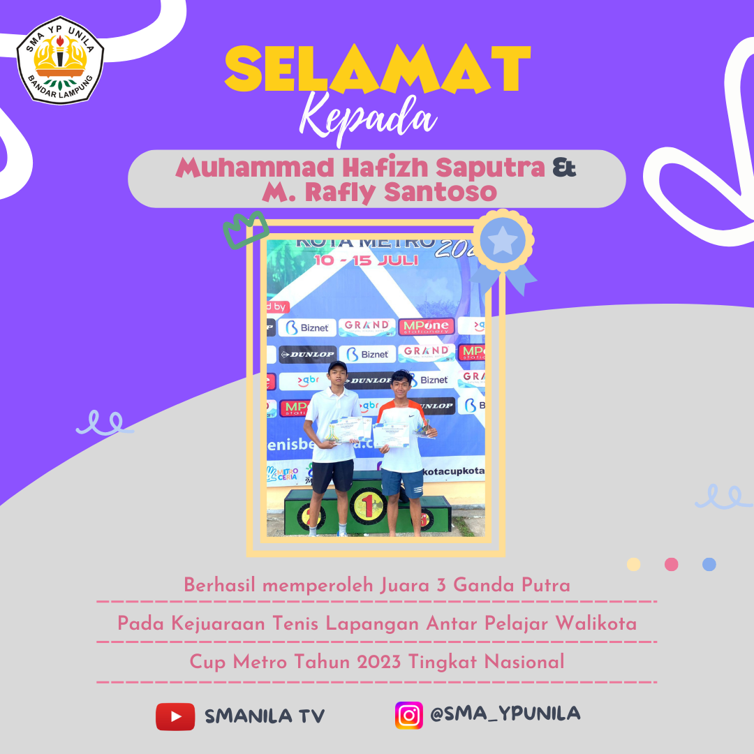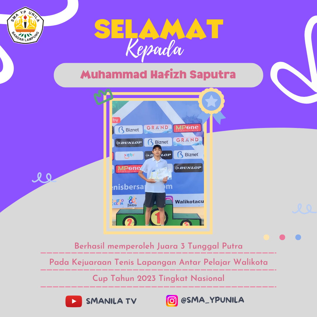 Selamat untuk ananda Muh. Hafizh Saputra yang telah memperoleh Juara 3 Tunggal Putra Pada kejuaraan Tenis Junior Walikota Cup tingkat Nasional tahun 2023 yang diselenggarakan oleh PELTI METRO Semoga prestasi yang membanggakan ini dapat menginspirasi rekan-rekan yang lain. #smanilajuara #2023yepeaja …