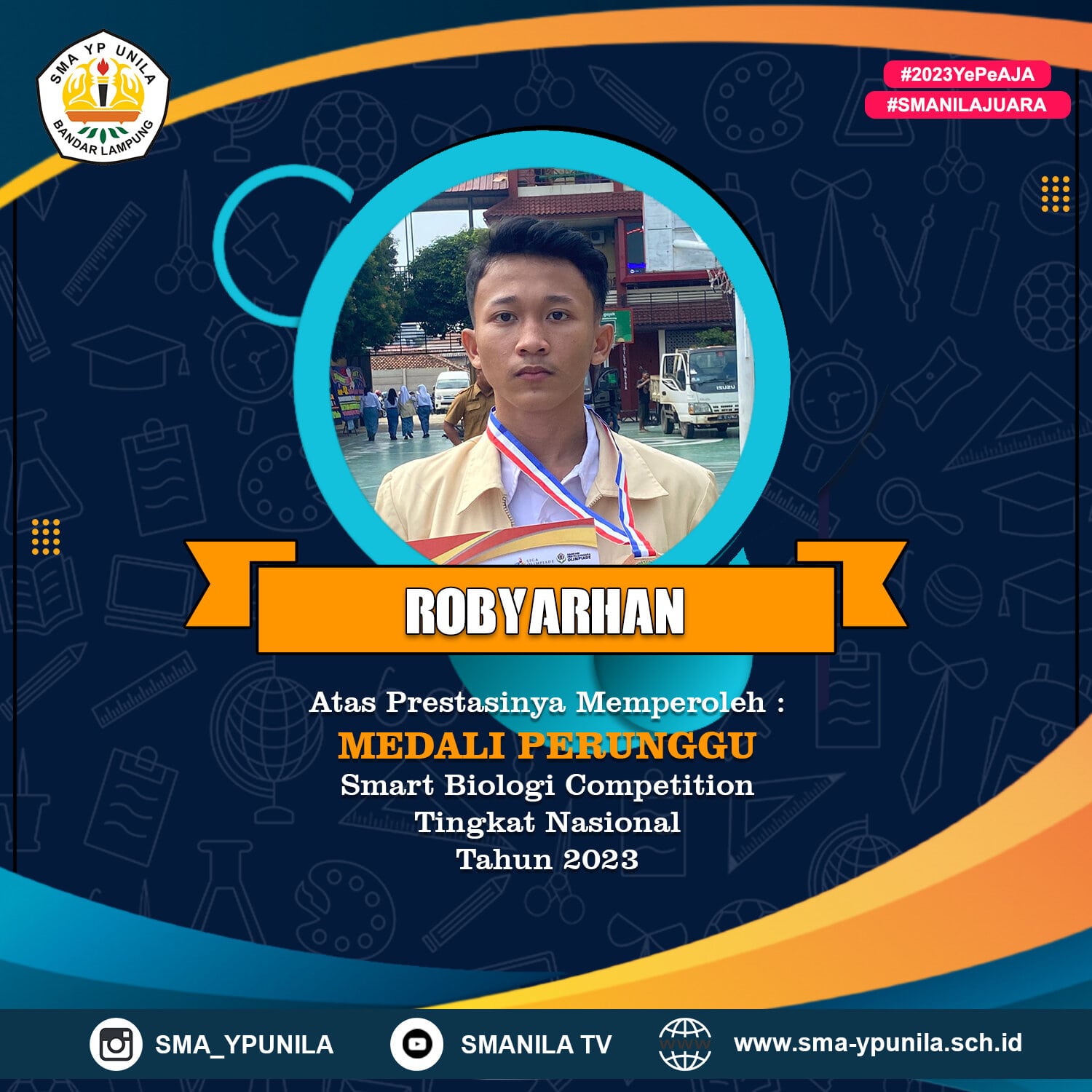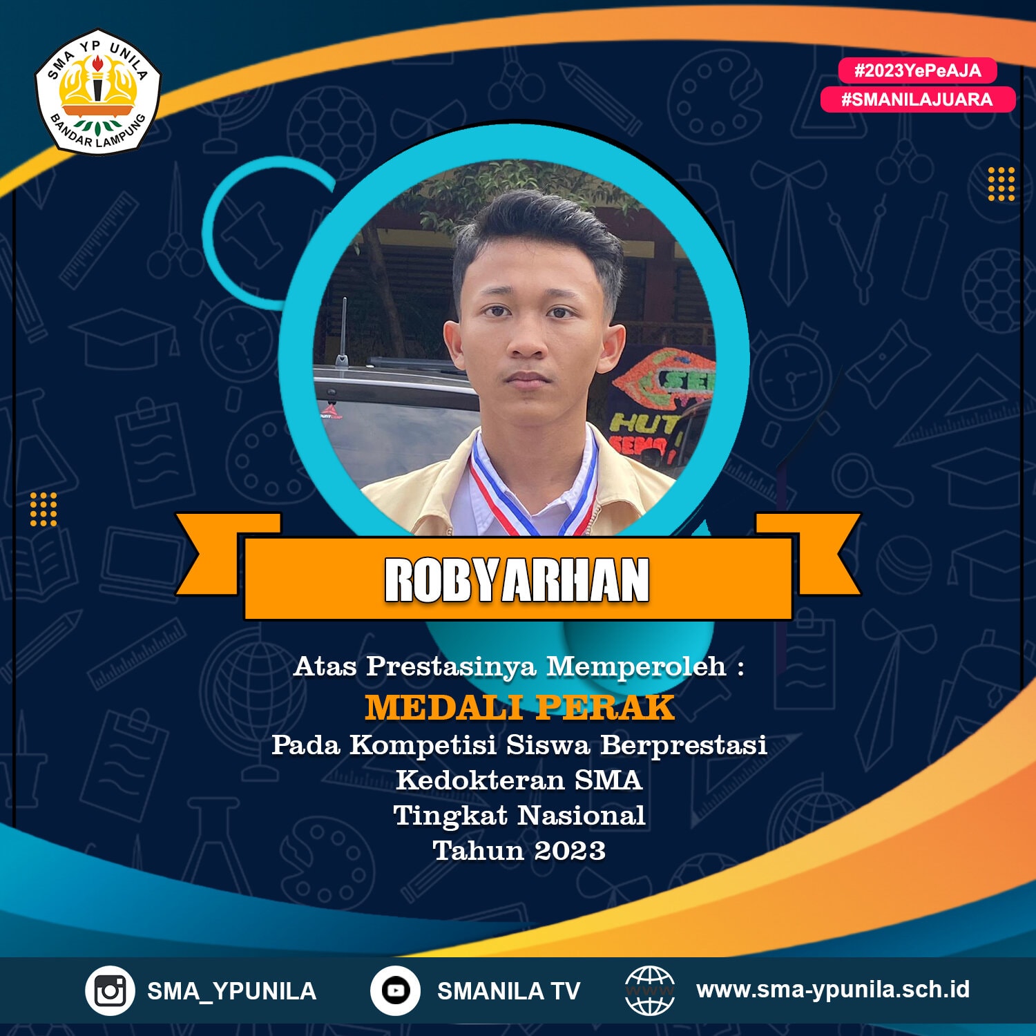 Selamat untuk ananda Robyarhan yang telah memperoleh Medali Perak pada Kompetisi Siswa Berprestasi Kedokteran SMA Tingkat Nasional tahun 2023 Semoga prestasi yang membanggakan ini dapat menginspirasi rekan-rekan yang lain. #smanilajuara #2023yepeaja #sekolahfavorit #bandarlampung #lampung